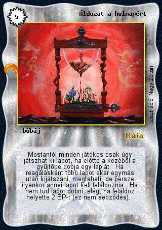 Kiadás: Chara-din visszatér Gyakoriság: ritka Lapszín (isten): Raia Típus: bűbáj Szöveg: Mostantól minden játékos csak úgy játszhat ki lapot, ha előtte a kezéből a gyűjtőbe dobja egy lapját. Ha reagálásként több lapot akar egymás után kijátszani, megteheti, de persze ilyenkor annyi lapot kell feláldoznia. Ha nem tud lapot dobni, elég, ha feláldoz helyette 2 ÉP-t (ez nem sebződés). Illusztráció: Nagy Zoltán