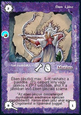 Kiadás: Két világ közt, Alappakli, 6. kiadás (Ősök Városa), Alappakli, 7. kiadás (Ősök Városa) Gyakoriság: gyakori Lapszín (isten): Mutáns Klán Típus: torzszülött Szöveg: Ében íjászból max. 5-öt rakhatsz a paklidba. (P): célpont lény vagy játékos X ÉP-t sebződik, ahol X a játékban levő Ében íjászaid száma. Szinesítő szöveg: "Az ében íjászok összehangolt munkájának eredménye egészen megdöbbentő. Három ében íjász akár egy Ongóliantot is tűpárnává lyuggat." Illusztráció: Kiss Márton Gyula