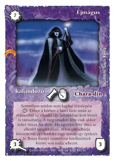 Kiadás: Chara-din visszatér, Védnök 2023 Gyakoriság: ritka Lapszín (isten): Chara-din Típus: kalandozó Szöveg: Semmilyen módon nem kaphat szintlépést. 2VP: Ebben a körben a harci fázis során az őrposztból az ellenfél egy tartalékban levő lényét is támadhatja. A megtámadott lény csak akkor üthet vissza, ha aktív. Ha egyetlen lény sincs az ellenfél tartalékjában, akkor támadhatja közvetlenül az ellenfelet vagy annak egy épületét is. Borax királyt semmilyen körülmények között sem tudja sebezni. Illusztráció: Gőgös Károly