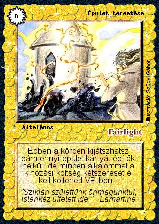 Kiadás: Alappakli, 3. kiadás, Alappakli, 4. kiadás, Hőskorszak Gyakoriság: nem gyakori Lapszín (isten): Fairlight Típus: általános Szöveg: Ebben a körben kijátszhatsz bármennyi épület kártyát építők nélkül, de minden alkalommal a kihozási költség kétszeresét el kell költened VP-ben. Szinesítő szöveg: "Sziklán születtünk önmagunktul, istenkéz ültetett ide." - Lamartine Illusztráció:
