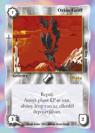 Kiadás: Alappakli, 1. kiadás, Védnök 2021 Gyakoriság: ritka Lapszín (isten): Raia Típus: szörny Szöveg: Repül. Annyi plusz ÉP-je van, ahány lény van az ellenfél őrposztjában. Illusztráció: Nagy Zoltán