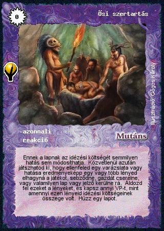 Kiadás: Alappakli, 5. kiadás (Ősök városa) Gyakoriság: ritka Lapszín (isten): Mutáns Klán Típus: azonnali Altípus: reakció Szöveg: Ennek a lapnak az idézési költségét semmilyen hatás sem módosíthatja. Közvetlenül azután játszhatod ki, hogy ellenfeled egy varázslata vagy hatása eredményeképp egy vagy több lényed elhagyná a játékot, sebződne, gazdát cserélne, vagy valamilyen lap vagy jelző kerülne rá. Áldozd fel ezeket a lényeket, és kapsz annyi VP-t, mint amennyi ezen lényeid idézési költségeinek összege volt. Húzz egy lapot. Illusztráció: Gőgös Károly