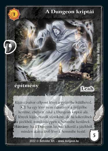 Szöveg: Kijátszásakor célpont lényt a gyűjtőbe küldheted. (K2), ha egy lény nem áldozástól kikerül a játékból, ehelyett ha akarod, a Dungeon kriptái alá kerül. E lények kijátszhatók vízióként, de ekkor kör végén mindenképpen a Semmibe kerülnek. Ha a Dungeon kriptái kikerül a játékból, minden alatta lévő lény a Semmibe kerül.