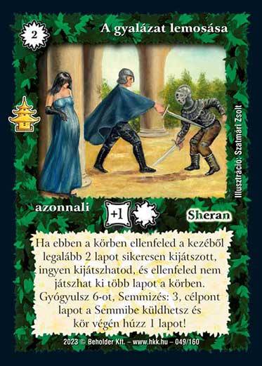 Kiadás: Császárváros Gyakoriság: ritka Lapszín (isten): Sheran Típus: azonnali Szöveg: Ha ebben a körben ellenfeled a kezéből legalább 2 lapot sikeresen kijátszott, ingyen kijátszhatod, és ellenfeled nem játszhat ki több lapot a körben. Gyógyulsz 6-ot, Semmizés: 3, célpont lapot a Semmibe küldhetsz és kör végén húzz 1 lapot! Illusztráció: Szatmári Zsolt