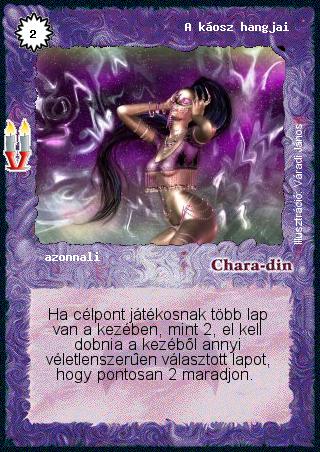 Kiadás: Régmúlt, Alappakli, 8. kiadás Gyakoriság: nem gyakori Lapszín (isten): Chara-din Típus: azonnali Szöveg: Ha célpont játékosnak több lap van a kezében, mint 2, el kell dobnia a kezéből annyi véletlenszerűen választott lapot, hogy pontosan 2 maradjon. Illusztráció: Váradi János