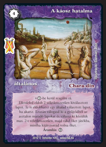Kiadás: Istenek viadala Gyakoriság: ritka Lapszín (isten): Chara-din Típus: általános Altípus: - Szöveg: +1_VP-be kerül reagálni rá. Ellenfeled eldob 2 véletlenszerűen kiválasztott lapot. Te is eldobhatsz egy általad választott lapot, ha akarsz. Ezután válogasd ki a gyűjtődből az asztalon maradó lapokat és válassz ki közülük max. 2-t véletlenszerűen, majd rakd őket játékba, mintha kijátszottad volna őket. Áramlás: 2_VP. Illusztráció: Szatmári Zsolt