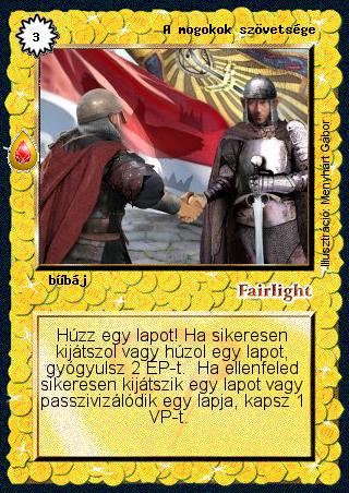 Kiadás: Zu'lit kincse Gyakoriság: ritka Lapszín (isten): Fairlight Típus: bűbáj Szöveg: Húzz egy lapot! Ha sikeresen kijátszol vagy húzol egy lapot, gyógyulsz 2 ÉP-t. Ha ellenfeled sikeresen kijátszik egy lapot vagy passzivizálódik egy lapja, kapsz 1 VP-t. Illusztráció: Menyhárt Gábor