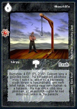 Szöveg: Büntetés: 4 ÉP. (P), 2 VP: Célpont lény a gyűjtőbe kerül. Ha költségként elköltesz még 1 szk-t is, akkor ez a képesség olyan lényre is használható, ami nem lehet hatás célpontja vagy nem hatnak rá a hatások. Ha már nincs több lény játékban, az akasztófát rögtön fel kell áldoznod, akkor is, ha passzív.