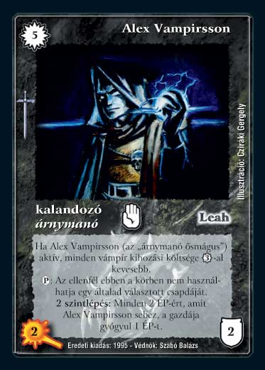 Kiadás: Hőskorszak, Védnök 2023 Gyakoriság: nem gyakori Lapszín (isten): Leah Típus: kalandozó Altípus: árnymanó Szöveg: Ha Alex Vampirsson (az "árnymanó ősmágus") aktív, minden vámpír kihozási költsége 3 VP-vel kevesebb. (P) Az ellenfél ebben a körben nem használhatja egy általad választott csapdáját. 2 szintlépés: Minden 2 ÉP-ért, amit Alex Vampirsson sebez, a gazdája gyógyul 1 ÉP-t. Illusztráció: Cziráki Gergely