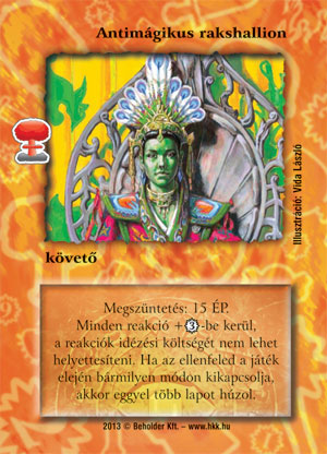 Kiadás: Világégés Gyakoriság: nem gyakori Lapszín (isten): Színtelen Típus: követő Altípus: - Szöveg: Megszüntetés: 15 ÉP. Minden reakció +3_VP-be kerül, a reakciók idézési költségét nem lehet helyettesíteni. Ha az ellenfeled a játék elején bármilyen módon kikapcsolja, akkor eggyel több lapot húzol. Illusztráció: Vida László