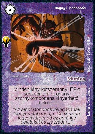 Kiadás: Alappakli, 5. kiadás (Ősök városa), Alappakli, 6. kiadás (Ősök Városa), Alappakli, 7. kiadás (Ősök Városa) Gyakoriság: ritka Lapszín (isten): Mutáns Klán Típus: azonnali Szöveg: Minden lény kétszerannyi ÉP-t sebződik, mint ahány szörnykomponens kinyerhető belőle. Szinesítő szöveg: "Az alpesi tehenek levágásának leggyorsabb módja. Csak aztán legyen türelmed az apró kis cafatokat összeszedni..." Illusztráció: Tervező: Csík János
