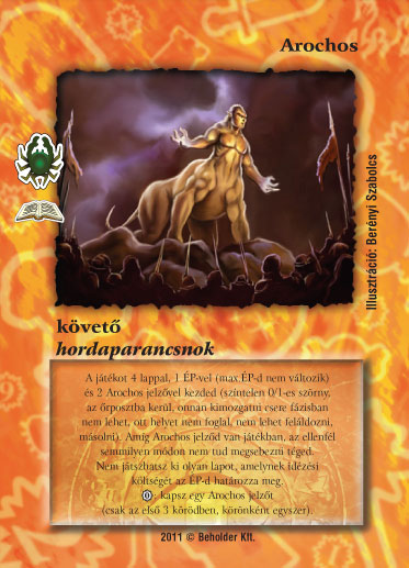 Kiadás: Krabber lázadás (Zén) Gyakoriság: ritka Lapszín (isten): Színtelen Típus: követő Altípus: hordaparancsnok Szöveg: A játékot 4 lappal, 1 ÉP-vel (max.ÉP-d nem változik) és 2 Arochos jelzővel kezded (színtelen 0/1-es szörny, az örposztba kerül, onnan kimozgatni csere fázisban nem lehet, ott helyet nem foglal, nem lehet feláldozni, másolni). Amíg Arochos jelződ van játékban, az ellenfél semmilyen módon nem tud megsebezni téged. Nem játszhatsz ki olyan lapot, amelynek idézési költségét az ÉP-d határozza meg. 0_VP: kapsz egy Arochos jelzőt (csak az első 3 körödben, körönként egyszer). Illusztráció: Berényi Szabolcs