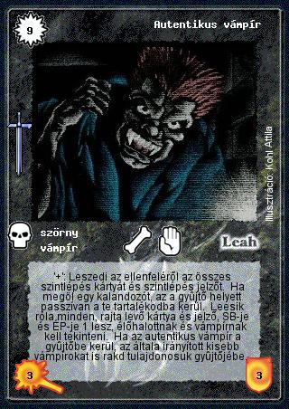 Szöveg: '+': Leszedi az ellenfeléről az összes szintlépés kártyát és szintlépés jelzőt. Ha megöl egy kalandozót, az a gyűjtő helyett passzívan a te tartalékodba kerül. Leesik róla minden, rajta levő kártya és jelző, SB-je és ÉP-je 1 lesz, élőhalottnak és vámpírnak kell tekinteni. Ha az autentikus vámpír a gyűjtőbe kerül, az általa irányított kisebb vámpírokat is rakd tulajdonosuk gyűjtőjébe.
