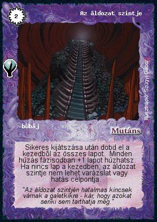 Kiadás: Alappakli, 5. kiadás (Ősök városa) Gyakoriság: nem gyakori Lapszín (isten): Mutáns Klán Típus: bűbáj Szöveg: Sikeres kijátszása után dobd el a kezedből az összes lapot. Minden húzás fázisodban +1 lapot húzhatsz. Ha nincs lap a kezedben, az áldozat szintje nem lehet varázslat vagy hatás célpontja. Szinesítő szöveg: "Az áldozat szintjén hatalmas kincsek várnak a galetkikre - kár, hogy azokat senki sem tarthatja meg." Illusztráció: