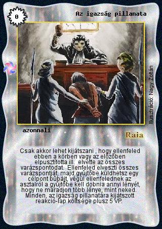 Kiadás: Létsíkok Gyakoriság: nem gyakori Lapszín (isten): Raia Típus: azonnali Szöveg: Csak akkor lehet kijátszani , hogy ellenfeled ebben a körben vagy az előzőben elpusztította ill. elvette az összes varázspontodat. Ellenfeled elveszti összes varázspontját, majd gyűjtőbe küldhetsz egy célpont bűbájt, végül ellenfelednek az asztalról a gyűjtőbe kell dobnia annyi lényét, hogy ne maradjon több lénye, mint neked. Minden, az igazság pillanatára kijátszott reakció-lap költsége plusz 5 VP. Illusztráció: Nagy Zoltán