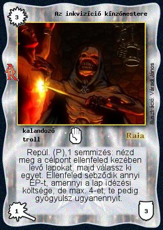 Kiadás: Alanori Krónika Gyakoriság: ritka Lapszín (isten): Raia Típus: kalandozó Altípus: troll Szöveg: Repül. (P),1 semmizés: nézd meg a célpont ellenfeled kezében levő lapokat, majd válassz ki egyet. Ellenfeled sebződik annyi ÉP-t, amennyi a lap idézési költsége, de max. 4-et, te pedig gyógyulsz ugyanennyit. Illusztráció: Váradi János