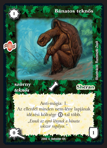 Kiadás: Tengermély Gyakoriság: gyakori Lapszín (isten): Sheran Típus: szörny Altípus: teknős Szöveg: Anti-mágia: 1. Az ellenfél minden nem-lény lapjának idézési költsége 1_VP-vel több. Szinesítő szöveg: "Ennek az apró lénynek a bánata sokszor ragályos." Illusztráció: Ruzsinszki Zsolt