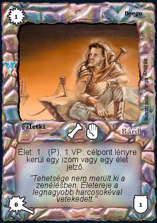 Kiadás: Káoszkatlan Gyakoriság: nem gyakori Lapszín (isten): Bárd Klán Típus: galetki Szöveg: Élet: 1. (P), 1 VP: célpont lényre kerül egy izom vagy egy élet jelző. Szinesítő szöveg: "Tehetsége nem merült ki a zenélésben. Életereje a legnagyobb harcosokéval vetekedett." Illusztráció: Varga András