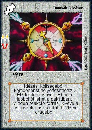 Kiadás: Régmúlt Gyakoriság: nem gyakori Lapszín (isten): Színtelen Típus: tárgy Szöveg: Idézési költségéből 1 komponenst helyettesíthetsz 2 ÉP feláldozásával. Ebből a lapból öt lehet a paklidban. Minden reakció forrás, kivéve a testrészek használatát, 5 VP-vel drágább. Illusztráció: Markó Gábor