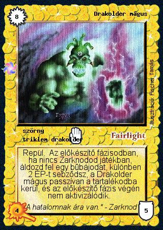 Kiadás: Létsíkok Gyakoriság: ritka Lapszín (isten): Fairlight Típus: szörny Altípus: drakolder Szöveg: Repül. Az előkészítő fázisodban, ha nincs Zarknodod játékban, áldozd fel egy bűbájodat, különben 2 ÉP-t sebződsz, a Drakolder mágus passzívan a tartalékodba kerül, és az előkészítő fázis végén nem aktivizálódik. Szinesítő szöveg: "A hatalomnak ára van." - Zarknod Illusztráció: Fischer Tamás