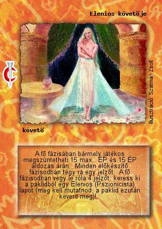 Kiadás: Sötét kor Gyakoriság: nem gyakori Lapszín (isten): Nincs Típus: követő Szöveg: A fő fázisában bármely játékos megszüntetheti 15 max. ÉP és 15 ÉP áldozás árán. Minden előkészítő fázisodban tégy rá egy jelzőt. A fő fázisodban végy le róla 4 jelzőt: keress ki a paklidból egy Elenios (Pszionicista) lapot (meg kell mutatnod, a paklid ezután keverd meg)!. Illusztráció: Szatmári Zsolt