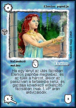 Kiadás: Isteni szövetség Gyakoriság: gyakori Lapszín (isten): Elenios Típus: kalandozó Altípus: mutáns Szöveg: Ha egy lényt az ütés fázisban Elenios papnője megsebez, és az túléli a harcot, akkor az passzívan a tartalékba kerül, és gazdája következő előkészítő fázisában csak 1 VP árán aktivizálódik. Illusztráció: Nagy Zoltán