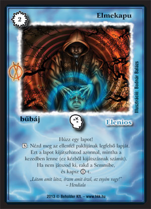 Kiadás: Hatalom Szövetsége Gyakoriság: ritka Lapszín (isten): Elenios Típus: bűbáj Szöveg: Húzz egy lapot! (S): Nézd meg az ellenfél paklijának legfelső lapját. Ezt a lapot kijátszhatod azonnal, mintha a kezedben lenne (ez kézből kijátszásnak számít). Ha nem játszod ki, rakd a Semmibe, és kapsz 1_VP-t. Szinesítő szöveg: "Látom amit látsz, érzem amit érzel, az enyém vagy!" - Hendiala Illusztráció: Bodnár Balázs