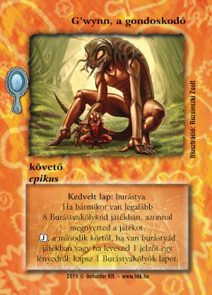 Kiadás: Tükördimenzió Gyakoriság: nem gyakori Lapszín (isten): Színtelen Típus: követő Altípus: epikus Szöveg: Kedvelt lap: burástya. Ha bármikor van legalább 8 Burástyakölyköd játékban, azonnal megnyerted a játékot. (J), a második körtől, ha van burástyád játékban vagy ha leveszel 1 jelzőt egy lényedről: kapsz 1 Burástyakölyök lapot. Illusztráció: Ruzsinszki Zsolt