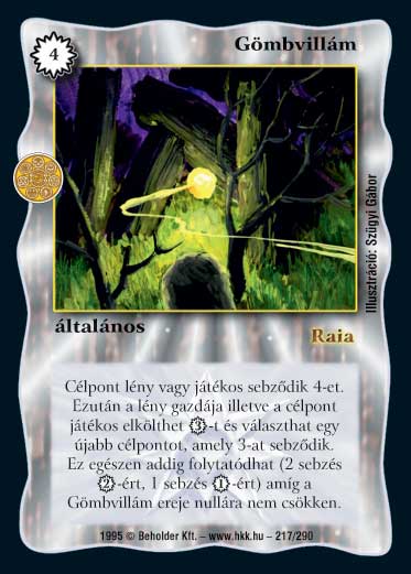 Kiadás: Alappakli, 3. kiadás, Hőskorszak, Védnök 2021, Túlélők Földje Gyakoriság: ritka Lapszín (isten): Raia Típus: általános Szöveg: Célpont lény vagy játékos sebződik 4 ÉP-t. Közvetlenül ezután célpont lény gazdája ill. a célpont játékos - ha akar - választhat egy újabb célpontot, amely 3 ÉP-t veszít (ekkor el kell költenie 3 VP-t), és ez egészen addig folytatódhat (2 sebzés/2VP, 1 sebzés/1 VP), amíg a gömbvillám ereje nullára nem csökken. Illusztráció: