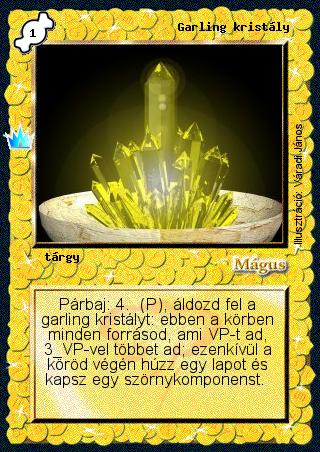 Kiadás: Ősi legendák Gyakoriság: nem gyakori Lapszín (isten): Mágus Klán Típus: tárgy Szöveg: Párbaj: 4. (P), áldozd fel a garling kristályt: ebben a körben minden forrásod, ami VP-t ad, 3 VP-vel többet ad; ezenkívül a köröd végén húzz egy lapot és kapsz egy szörnykomponenst. Illusztráció: Váradi János