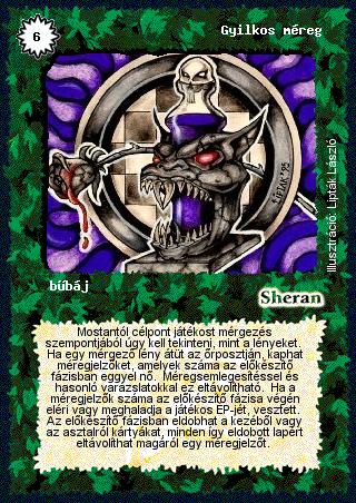 Kiadás: Alappakli, 3. kiadás, Alappakli, 4. kiadás, Hőskorszak, Védnök 2025 Gyakoriság: ritka Lapszín (isten): Sheran Típus: bűbáj Szöveg: Mostantól célpont játékost mérgezés szempontjából úgy kell tekinteni, mint a lényeket. Ha egy mérgező lény átüt az őrposztján, kaphat méregjelzőket, amelyek száma az előkészítő fázisban eggyel nő. Méregsemlegesítéssel és hasonló varázslatokkal ez eltávolítható. Ha a méregjelzők száma az előkészítő fázisa végén eléri vagy meghaladja a játékos ÉP-jét, vesztett. Az előkészítő fázisban eldobhat a kezéből vagy az asztalról kártyákat, minden így eldobott lapért eltávolíthat magáról egy méregjelzőt. Illusztráció: Lipták László
