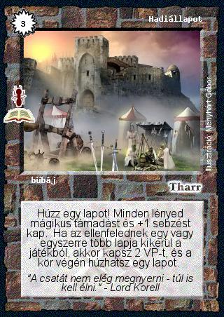 Kiadás: Az őshangya boly (Zén) Gyakoriság: ritka Lapszín (isten): Tharr Típus: bűbáj Szöveg: Húzz egy lapot! Minden lényed mágikus támadást és +1 sebzést kap. Ha az ellenfelednek egy vagy egyszerre több lapja kikerül a játékból, akkor kapsz 2 VP-t, és a kör végén húzhatsz egy lapot. Szinesítő szöveg: "A csatát nem elég megnyerni - túl is kell élni." - Lord Korell Illusztráció: Menyhárt Gábor
