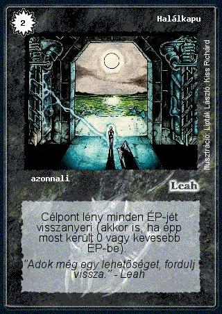 Kiadás: Alappakli, 3. kiadás, Alappakli, 4. kiadás, Hőskorszak Gyakoriság: nem gyakori Lapszín (isten): Leah Típus: azonnali Szöveg: Célpont lény minden ÉP-jét visszanyeri (akkor is, ha épp most került 0 vagy kevesebb ÉP-be). Szinesítő szöveg: "Adok még egy lehetőséget, fordulj vissza." - Leah Illusztráció: Lipták László, Kiss Richárd