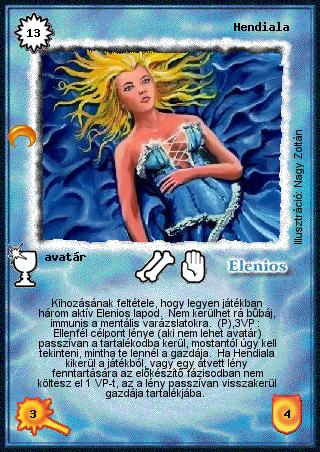 Kiadás: Chara-din visszatér Gyakoriság: ritka Lapszín (isten): Elenios Típus: avatár Szöveg: Kihozásának feltétele, hogy legyen játékban három aktív Elenios lapod. Nem kerülhet rá bűbáj, immunis a mentális varázslatokra. (P),3VP: Ellenfél célpont lénye (aki nem lehet avatár) passzívan a tartalékodba kerül, mostantól úgy kell tekinteni, mintha te lennél a gazdája. Ha Hendiala kikerül a játékból, vagy egy átvett lény fenntartására az előkészítő fázisodban nem költesz el 1 VP-t, az a lény passzívan visszakerül gazdája tartalékjába. Illusztráció: Nagy Zoltán