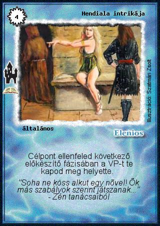 Kiadás: Timera kastélya (Zén) Gyakoriság: ritka Lapszín (isten): Elenios Típus: általános Szöveg: Célpont ellenfeled következő előkészítő fázisában a VP-t te kapod meg helyette. Szinesítő szöveg: "Soha ne köss alkut egy nővel! Ők más szabályok szerint játszanak..." - Zén tanácsaiból Illusztráció: Szatmári Zsolt