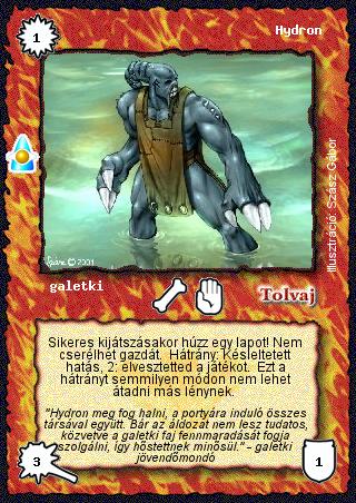 Kiadás: Víziók, Alappakli, 7. kiadás (Ősök Városa) Gyakoriság: ritka Lapszín (isten): Tolvaj Klán Típus: galetki Szöveg: Sikeres kijátszásakor húzz egy lapot! Nem cserélhet gazdát. Hátrány: Késleltetett hatás, 2: elvesztetted a játékot. Ezt a hátrányt semmilyen módon nem lehet átadni más lénynek. Szinesítő szöveg: "Hydron meg fog halni, a portyára induló összes társával együtt. Bár az áldozat nem lesz tudatos, közvetve a galetki faj fennmaradását fogja szolgálni, így hőstettnek minősül." - galetki jövendőmondó Illusztráció: Szász Gábor