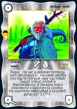 Kiadás: Aranyforrás, Túlélők Földje Gyakoriság: gyakori Lapszín (isten): Raia Típus: szörny Altípus: manó Szöveg: Repül. Ha van a játékban fémtárgy, nem játszhatod ki. Ha valaki játékba hoz egy fémtárgyat vagy egy másik repülő manót (kivéve a Manókirálynőt), a Jóságos manó visszakerül a tulajdonosa kezébe. Ha sikeresen kijátszottad a kezedből, gyógyulsz 2 ÉP-t. Illusztráció: