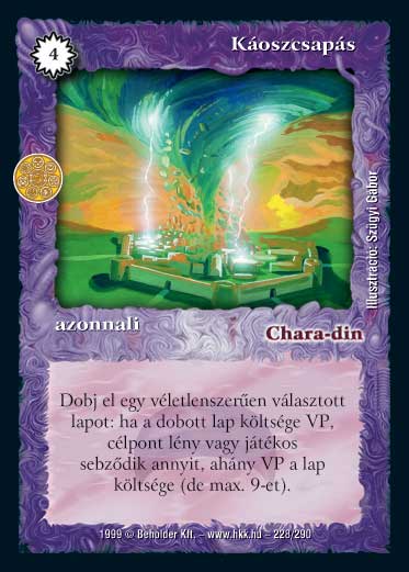Szöveg: Sikeres kijátszása után dobj el egy véletlenszerűen választott lapot a kezedből. Ha ez egy VP-ért kijövő lap, célpont lény vagy játékos annyit sebződik, ahány VP ennek a lapnak az idézési költsége volt (a ? és X értéke nulla). A Káoszcsapással max. 9-et sebezhetsz.