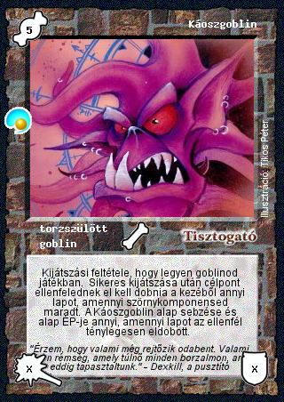 Szöveg: Kijátszási feltétele, hogy legyen goblinod játékban. Sikeres kijátszása után célpont ellenfelednek el kell dobnia a kezéből annyi lapot, amennyi szörnykomponensed maradt. A Káoszgoblin alap sebzése és alap ÉP-je annyi, amennyi lapot az ellenfél ténylegesen eldobott.