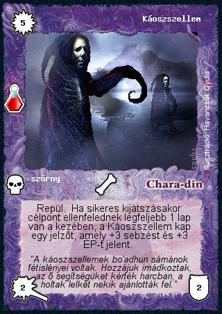 Kiadás: Esthar Császárság Gyakoriság: nem gyakori Lapszín (isten): Chara-din Típus: szörny Szöveg: Repül. Ha sikeres kijátszásakor célpont ellenfelednek legfeljebb 1 lap van a kezében, a Káoszszellem kap egy jelzőt, amely +3 sebzést és +3 ÉP-t jelent. Szinesítő szöveg: "A káoszszellemek bo'adhun sámánok fétislényei voltak. Hozzájuk imádkoztak, az ő segítségüket kérték harcban, a holtak lelkét nekik ajánlották fel." Illusztráció: Havancsák Gyula