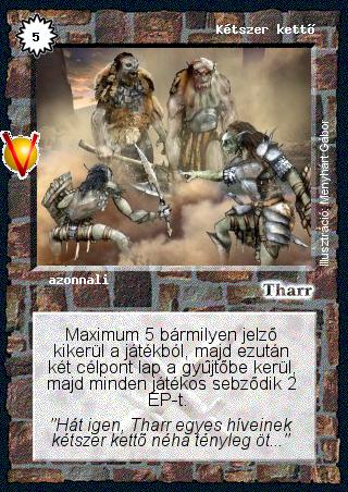 Kiadás: Legendák Völgye Gyakoriság: ritka Lapszín (isten): Tharr Típus: azonnali Szöveg: Maximum 5 bármilyen jelző kikerül a játékból, majd ezután két célpont lap a gyűjtőbe kerül, majd minden játékos sebződik 2 ÉP-t. Szinesítő szöveg: "Hát igen, Tharr egyes híveinek kétszer kettő néha tényleg öt..." Illusztráció: Menyhárt Gábor