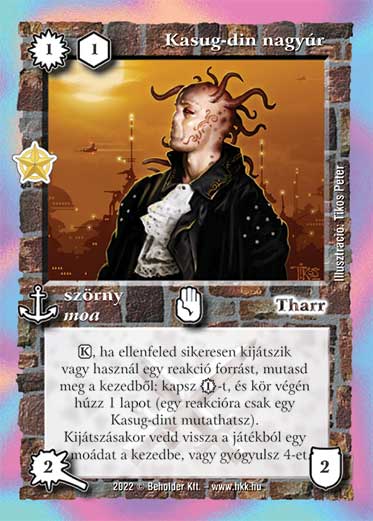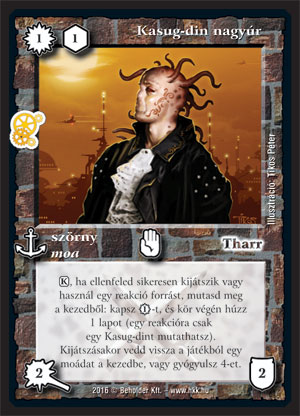 Kiadás: Kreátor műhelye Gyakoriság: ritka Lapszín (isten): Tharr Típus: szörny Altípus: moa Szöveg: (K), ha ellenfeled sikeresen kijátszik vagy használ egy reakció forrást, mutasd meg a kezedből: kapsz 1_VP-t, és kör végén húzz 1 lapot (egy reakcióra csak egy Kasug-dint mutathatsz). Kijátszásakor vedd vissza a játékból egy moádat a kezedbe, vagy gyógyulsz 4-et. Illusztráció: Tikos Péter
