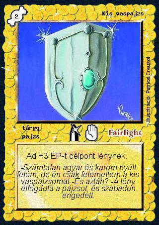 Kiadás: Alappakli, 1. kiadás, Alappakli, 2. kiadás, Alappakli, 3. kiadás, Alappakli, 4. kiadás Gyakoriság: nem gyakori Lapszín (isten): Fairlight Típus: tárgy Altípus: pajzs Szöveg: Ad +3 ÉP-t célpont lénynek. Szinesítő szöveg: -Számtalan agyar és karom nyúlt felém, de én csak felemeltem a kis vaspajzsomat -És aztán? -A lény elfogadta a pajzsot, és szabadon engedett. Illusztráció: Patrice Creusot