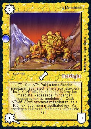 Kiadás: Árnyékhold Gyakoriság: ritka Lapszín (isten): Fairlight Típus: szörny Szöveg: (P), X+1 VP: Rakj a tartalékodba passzívan egy jelzőt, amely egy játékban levő, X VP idézési költségű szörny lap másolata, képességei mindenben megegyeznek az eredetiével. Csak VP-ért kijövő szörnyet másolhatsz, és a Klónteknőcöt nem másolhatod így. Az esetleges kijátszási feltételnek teljesülnie kell. Illusztráció: Vida László