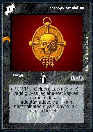 Kiadás: Chara-din visszatér Gyakoriság: ritka Lapszín (isten): Leah Típus: tárgy Szöveg: (P),1VP: Célpont Leah lény kör végéig 3-as jégleheletet kap és immunis lesz a hidegtámadásokra. Nem használhatod olyan lényre, aki már tud lehelni. Illusztráció: Markó Gábor