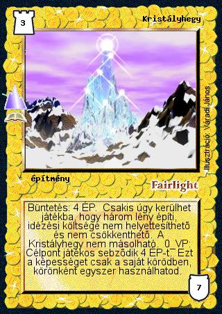 Kiadás: Kristályhegy (Zén) Gyakoriság: ritka Lapszín (isten): Fairlight Típus: építmény Szöveg: Büntetés: 4 ÉP. Csakis úgy kerülhet játékba, hogy három lény építi, idézési költsége nem helyettesíthető és nem csökkenthető. A Kristályhegy nem másolható. 0 VP: Célpont játékos sebződik 4 ÉP-t. Ezt a képességet csak a saját körödben, körönként egyszer használhatod. Illusztráció: Váradi János