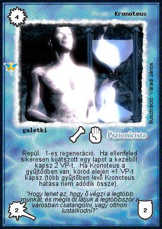 Kiadás: Káoszkatlan, Alappakli, 7. kiadás (Ősök Városa) Gyakoriság: ritka Lapszín (isten): Pszionicista Klán Típus: galetki Szöveg: Repül. 1-es regeneráció. Ha ellenfeled sikeresen kijátszott egy lapot a kezéből, kapsz 2 VP-t. Ha Kronoteus a gyűjtődben van, köröd elején +1 VP-t kapsz (több gyűjtőben levő Kronoteus hatása nem adódik össze). Szinesítő szöveg: "Hogy lehet az, hogy ő végzi a legtöbb munkát, és mégis őt látjuk a legtöbbször a városban csatangolni, vagy otthon lustálkodni?" Illusztráció: Váradi János