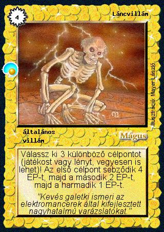 Kiadás: Két világ közt, Alappakli, 6. kiadás (Ősök Városa), Alappakli, 7. kiadás (Ősök Városa) Gyakoriság: ritka Lapszín (isten): Mágus Klán Típus: általános Altípus: villám Szöveg: Válassz ki 3 különböző célpontot (játékost vagy lényt, vegyesen is lehet)! Az első célpont sebződik 4 ÉP-t, majd a második 2 ÉP-t, majd a harmadik 1 ÉP-t. Szinesítő szöveg: "Kevés galetki ismeri az elektromancerek által kifejlesztett nagyhatalmú varázslatokat." Illusztráció: Mayer László