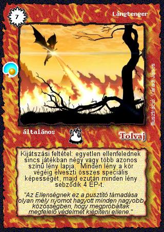Kiadás: Két világ közt Gyakoriság: ritka Lapszín (isten): Tolvaj Klán Típus: általános Szöveg: Kijátszási feltétel: egyetlen ellenfelednek sincs játékban négy vagy több azonos színű lény lapja. Minden lény a kör végéig elveszti összes speciális képességét, majd ezután minden lény sebződik 4 ÉP-t. Szinesítő szöveg: "Az Ellenségnek ez a pusztító támadása olyan mély nyomot hagyott minden nagyobb közösségben, hogy megpróbáltak megfelelő védelmet kiépíteni ellene." Illusztráció: Váradi János