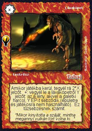 Szöveg: Amikor játékba kerül, tegyél rá 2*X jelzőt. +: vegyél le a lávaköpetről Y jelzőt: az a lény, akivel a galetki harcol, Y ÉP-t sebződik (épületre és játékosra nem használható). Ez tűzsebzésnek számít.